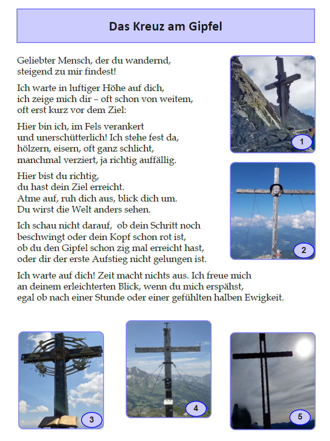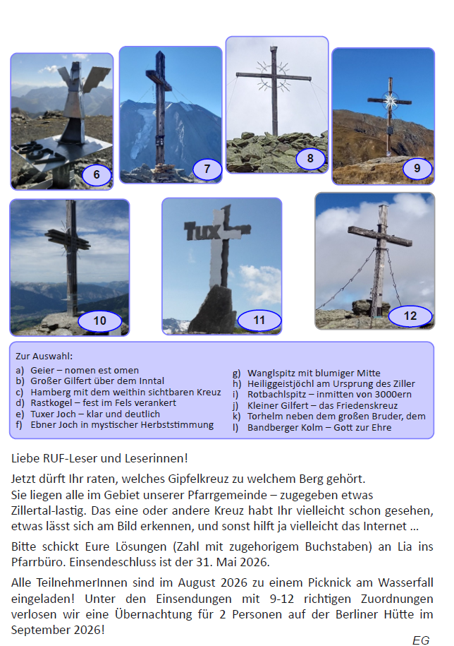 Wer kann die Gipfelkreuze den passenden Berggipfeln zuordnen? Alle Teilnehmer*innen sind im August zu einem Picknick am Wasserfall eingeladen. Unter alle, die 9 bis 12 richtige Zuordnungen haben, wird eine Übernachtung auf der Berliner Hütte im September 2026 verlost!