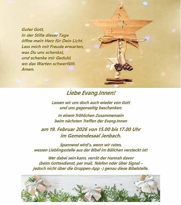 Sonntag 25. Jänner 2026, 19:00 Uhr in der neuapostolischen Kirche in Jenbach